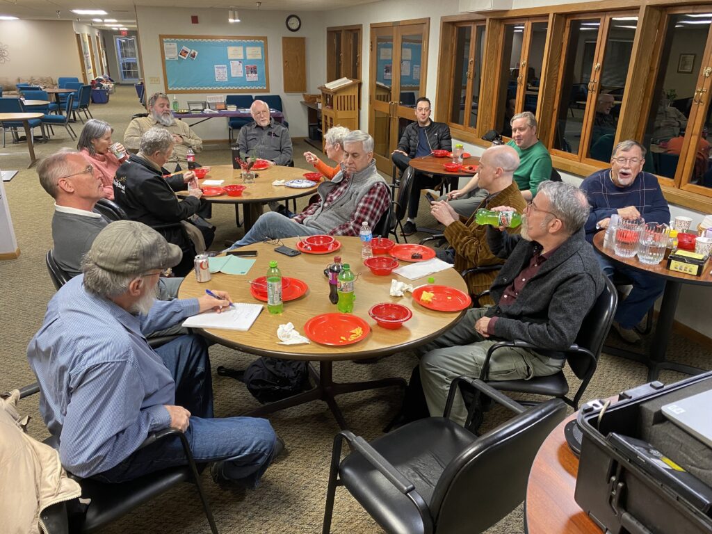 Time again for our annual Chili Dinner! It was a great crowd at Discovery United Methodist Church–13 people were there in person, andTodd Anderson joined us via Zoom. Special thanks go to Sandy Meyer (and Steve!) who catered the dinner. The menu was chili, cornbread, veggies, dessert, and more! Very good food, and everyone enjoyed it.